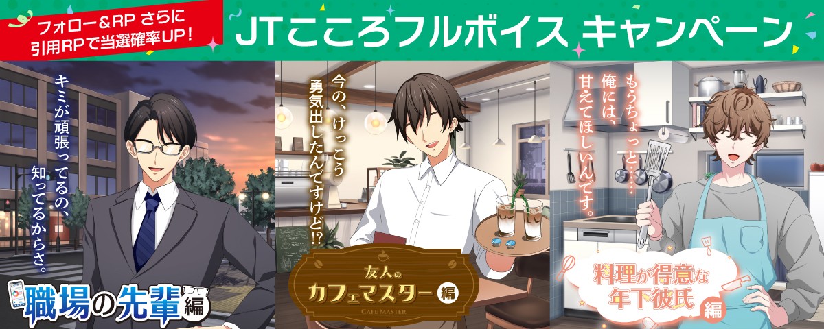 2025年10月30日より実施したキャンペーン男性ボイス版では、声優の森久保祥太郎さんによるシチュエーションボイスを起点に、キャンペーンから台本・画像素材の配布という導線設計により、ユーザーが参加したくなる施策を実施。JT Group Purpose 「心の豊かさを、もっと。」を、日常のワンシーンと声優の声を通じてお届けしました。