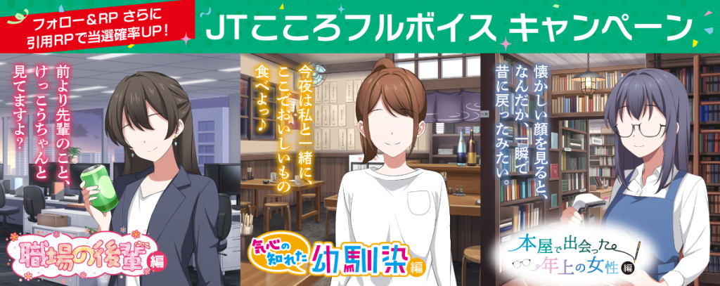 続くキャンペーン女性ボイス版は、本日2025年11月17日から開始となります。女性ボイス版では声優の上坂すみれさんによる、男性ボイス版と異なるシチュエーションのボイスとその台本をお届けします。詳細はJT公式X(https://x.com/JTofficialjp)からの告知をご確認ください。