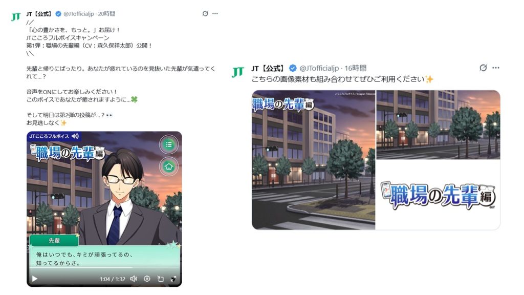 本施策は、当社のエンターテインメントマーケティングレーベル「Modern Age/モダンエイジ」による企画で、公式SNSにおいて声優のシチュエーションボイスを起点にしたキャンペーンを通じて、JTの認知およびパーパス理解の訴求を目指します。