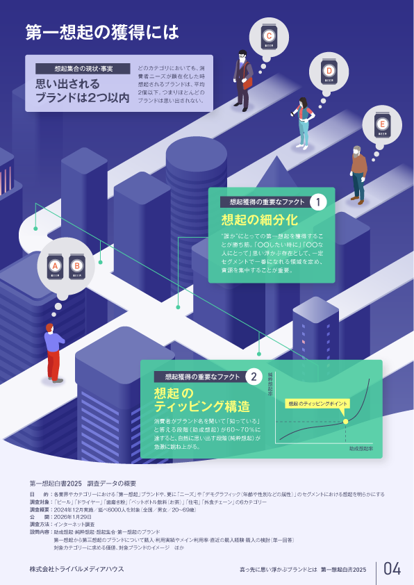 『第一想起白書2025』では、第一想起獲得の鍵として大きく2点を提示しました。1つ目は「想起の細分化」、2つ目は「想起のティッピング構造」です。