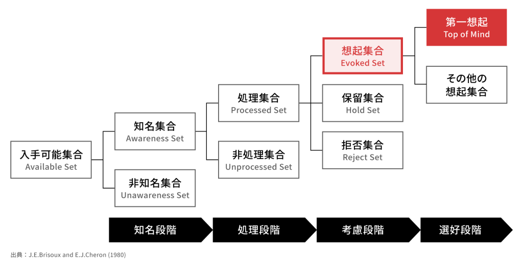 入口が立ち上がったとき、人はそのカテゴリーのすべて見比べてから決めるわけではありません。まず頭に浮かんだ少数の候補が並び、その中で比較と判断が進みます。そして最初に呼び出される候補の集合が想起集合です。